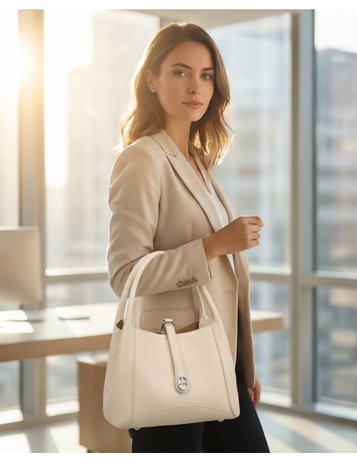 Profinjena moderna torba koja je savršen spoj klasične forme i modernih detalja, ističući se svojom čvrstom strukturom i luksuznom teksturom. Kontrastni tekstilni remen s logotipom daje joj upečatljiv urban izgled, čineći je idealnim izborom za damu koja voli detalje koji pričaju priču.