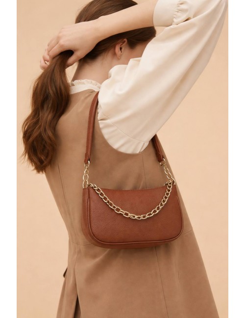 Mala smeđa kožna torbica sa zlatnim lancem