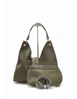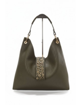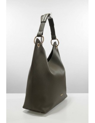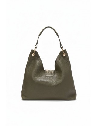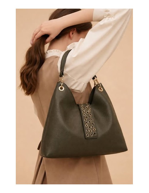 Maslinasto zelena torba strukturiranog dizajna ističe se upečatljivim remenom s metalnim zakovicama koji joj daje moderan, pomalo buntovni karakter. Njena prostrana unutrašnjost i elegantni zlatni detalji čine je idealnim izborom za žene koje traže upečatljiv, a istovremeno funkcionalan komad za poslovne i dnevne prilike.