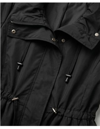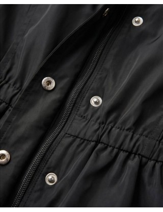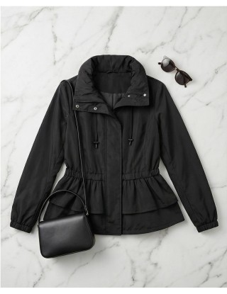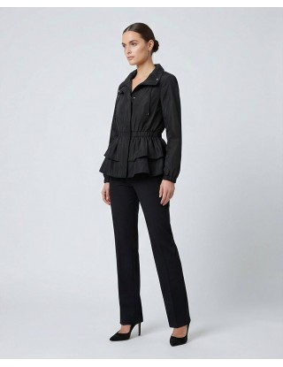 Moderni model crne jakne ističe se elastičnim strukom i efektnim dvoslojnim volanima na donjem dijelu, pružajući savršenu ravnotežu između opuštenog i chic izgleda.