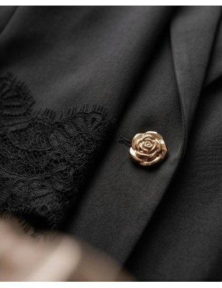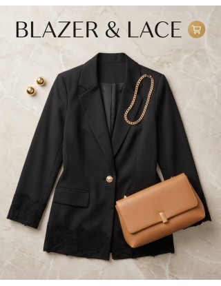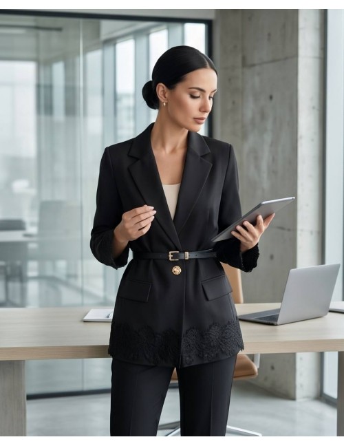 Upečatljivi sako savršen je spoj klasičnog kroja i modernih, ženstvenih detalja. Strukturirana silueta naglašena je tankim remenom s elegantnom zlatnom kopčom, dok fini rubovi od crne čipke na rukavima i donjem rubu sakoa dodaju dozu luksuza i profinjenosti.