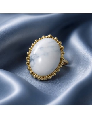 Metalni prsten sa velikim kamenom ima elegantan dizajn i izrađen je od sjajnog metala. Središnji kamen, koji može biti proziran ili obojen, dodaje mu posebnu privlačnost i sofisticiranost.