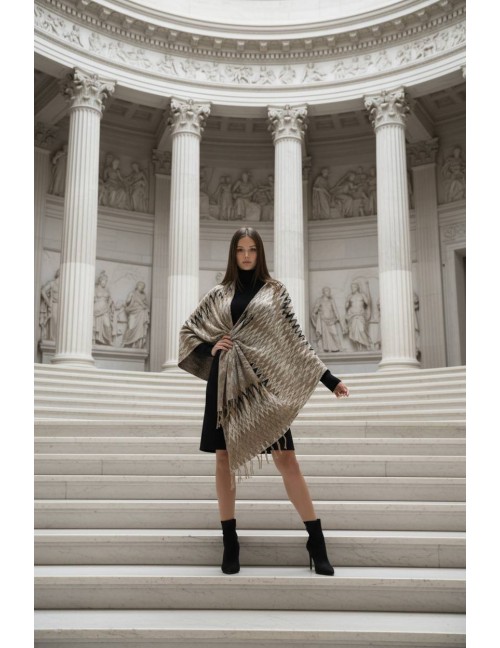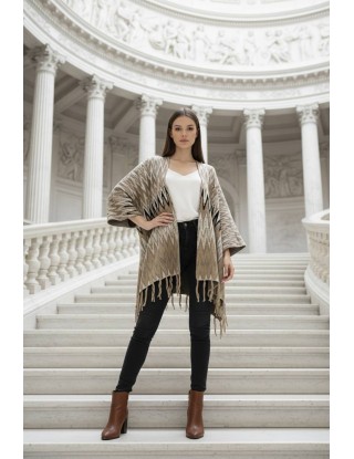 Kardigan u svijetlim tonovima s upečatljivim cik-cak uzorkom. Model je širok i ležeran, sa resicama na rubu koje mu daju dodatnu dinamiku. Može se nositi opušteno prebačen preko ramena ili zavezati sprijeda. Savršen za jesenje i zimske kombinacije.