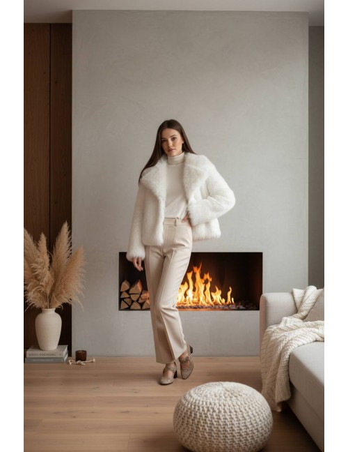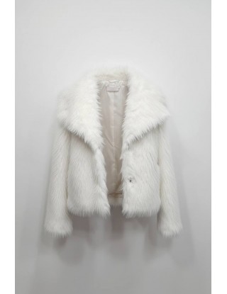 Kratka bunda od umjetnog krzna u snježno bijeloj boji savršen je spoj elegancije i zimske praktičnosti. Odlikuje se iznimno bogatom i mekanom teksturom koja pruža vrhunsku toplinu, voluminozni ovratnik dodaje notu glamura cijelom izgledu. Zahvaljujući svojoj svijetloj nijansi, ova bunda osvježava svaku zimsku odjevnu kombinaciju, pružajući osjećaj luksuza i udobnosti.