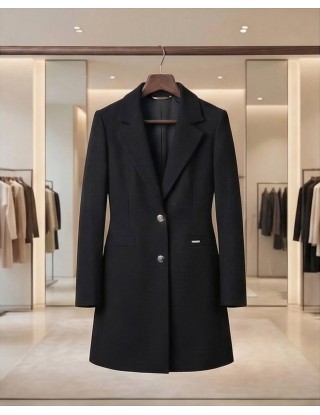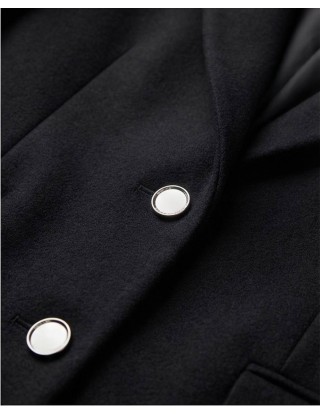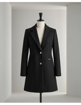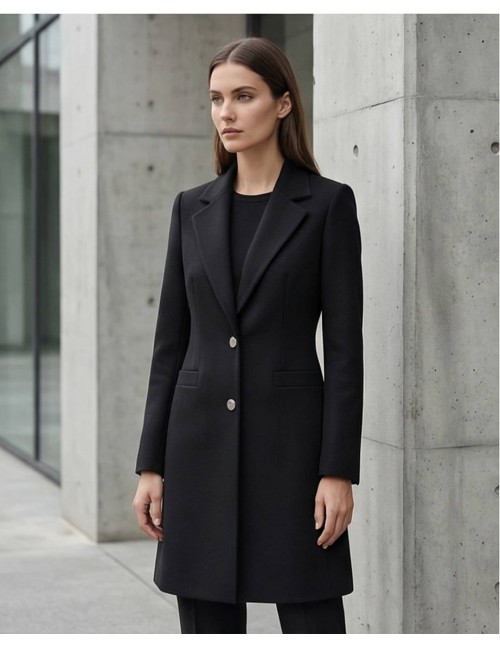 Kratki kaput u bezvremenskoj crnoj strukiranog kroja idealan je za prijelazna razdoblja i poslovne prigode u kojima je prioritet elegantna i uredna silueta.