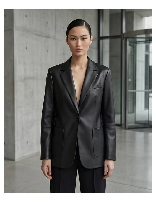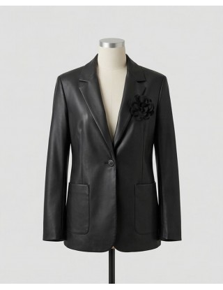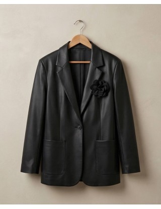 Moderan crni sako od umjetne kože idealan je za postizanje odvažnog i chic izgleda. Odlikuje ga klasičan kroj s reverima i kopčanjem na jedan gumb, dok upečatljiv 3D cvjetni detalj na reveru unosi dozu ženstvenosti u strogu siluetu.