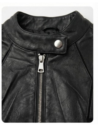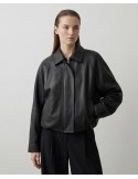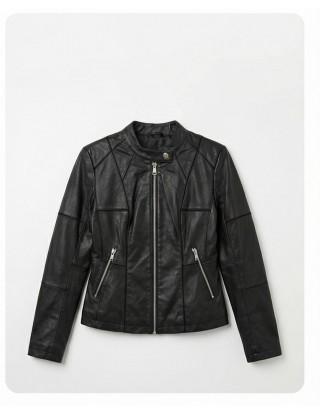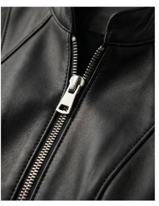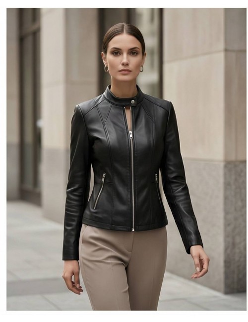 Moderna crna kožna jakna strukiranog kroja s naglašenim šavovima koji prate liniju tijela te ruskom kragnom.