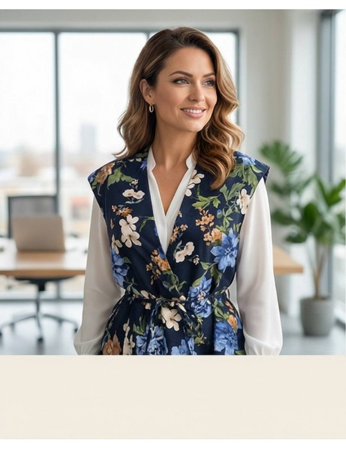 Prsluk s bogatim cvjetnim motivima savršen je izbor za slojevito odijevanje koje svakoj kombinaciji daje dozu profinjenosti i karaktera. Zahvaljujući podesivom pojasu koji naglašava struk, ovaj komad laskavo pristaje svakoj figuri i unosi dašak ženstvenosti u tvoj svakodnevni stil.