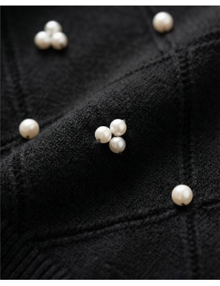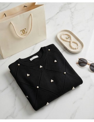 Elegantna crna majica s kratkim rukavima spaja udobnost mekanog pletiva i luksuz bisernih detalja. Romboidni uzorak s utkanim biserima daje joj profinjen, "skupocjen" izgled koji savršeno podiže svaku kombinaciju, od poslovnih hlača do traperica.