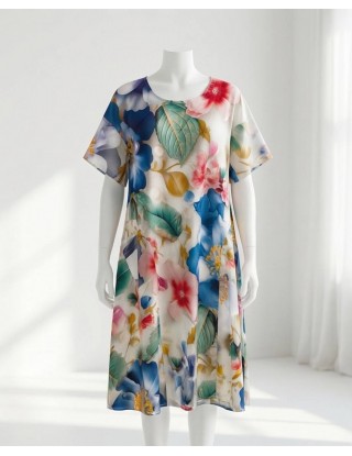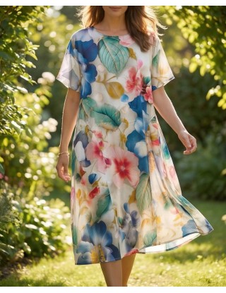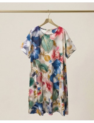 Lepršava haljina A kroja s upečatljivim, velikim cvjetnim uzorkom unosi svježinu u svaku garderobu. Na svijetloj podlozi ističu se bogati cvjetovi u jarkim nijansama plave, crvene, ružičaste i zelene, stvarajući vedar i moderan izgled.