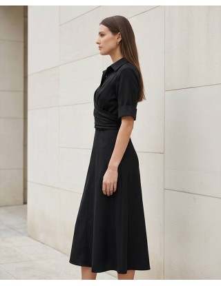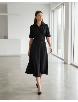 Profinjena haljina na preklop savršen je spoj klasičnog košulja-stila i ženstvenog kroja. Krasi je elegantan ovratnik, kratki rukavi s manžetama i pojas u struku na vezanje koji savršeno ističe figuru. Izrađena je od kvalitetnog, lagano rastezljivog materijala koji osigurava cjelodnevnu udobnost, što je čini idealnim izborom za poslovne sastanke, formalne događaje ili profinjen dnevni izgled.