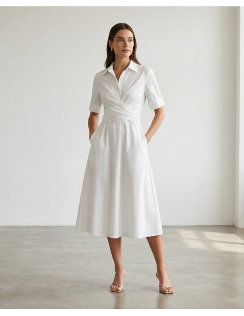 Profinjena haljina na preklop savršen je spoj klasičnog košulja-stila i ženstvenog kroja. Krasi je elegantan ovratnik, kratki rukavi s manžetama i pojas u struku na vezanje koji savršeno ističe figuru. Izrađena je od kvalitetnog, lagano rastezljivog materijala koji osigurava cjelodnevnu udobnost, što je čini idealnim izborom za poslovne sastanke, formalne događaje ili profinjen dnevni izgled.