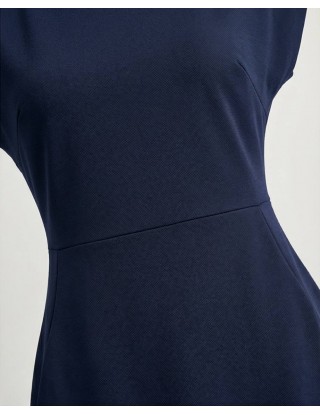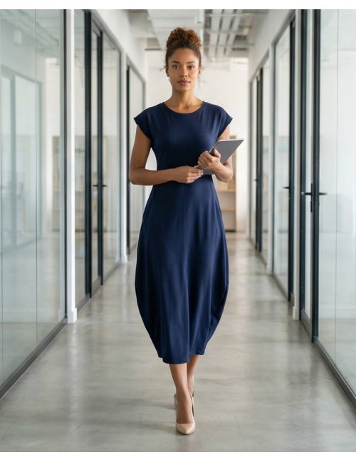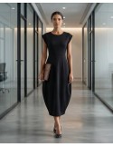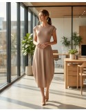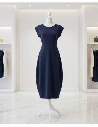 Midi haljina u nježnoj nijansi savršen je primjer modernog minimalizma. Odlikuje se diskretnim okruglim izrezom, kratkim rukavima i jedinstvenim "balon" krojem donjeg dijela koji pruža suptilan volumen i eleganciju. Struk je blago naglašen, čime se stvara besprijekorna silueta idealna za dnevne i večernje prilike u kojima želite izgledati profinjeno.