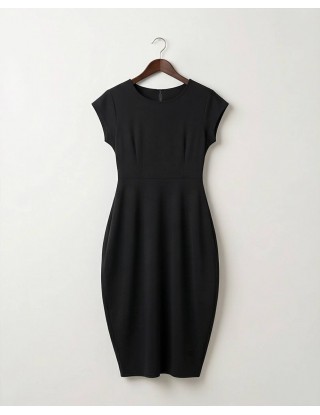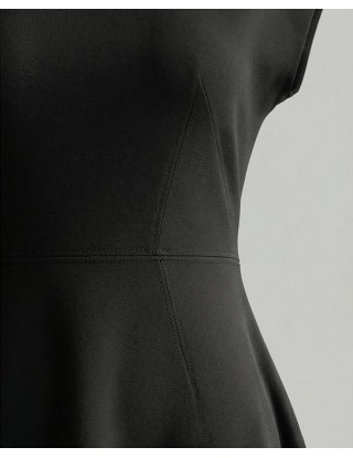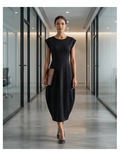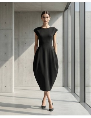 Midi haljina u crnoj nijansi savršen je primjer modernog minimalizma. Odlikuje se diskretnim okruglim izrezom, kratkim rukavima i jedinstvenim "balon" krojem donjeg dijela koji pruža suptilan volumen i eleganciju. Struk je blago naglašen, čime se stvara besprijekorna silueta idealna za dnevne i večernje prilike u kojima želite izgledati profinjeno.