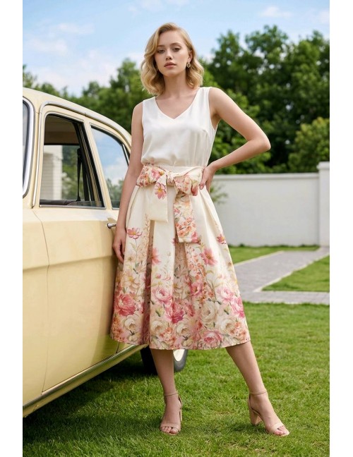 Elegantna midi suknja A-kroja osvaja bogatim cvjetnim printom u nijansama plave, bež i zlatne boje. Visoki struk naglašen je upečatljivom mašnom, dok voluminozni nabori pružaju profinjenu siluetu idealnu za svečane prigode. Savršen je izbor za chic izgled koji spaja klasičnu ženstvenost i moderan dizajn.
