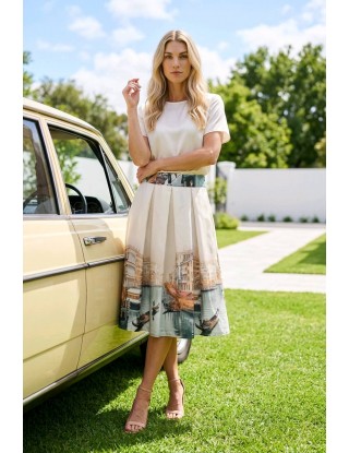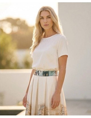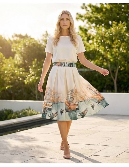 Elegantna midi suknja s predivnim printom venecijanskih kanala i gondola unosi dašak talijanskog šarma u svaku kombinaciju. Zahvaljujući elastičnoj gumi u struku i nježnim naborima, pruža maksimalnu udobnost i savršeno se prilagođava vašoj figuri.
