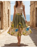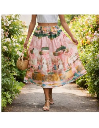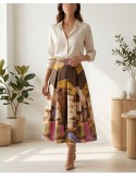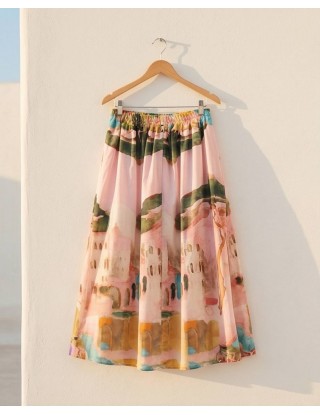 Šarmantna suknja koja se ističe upečatljivim bojama i zanimljivim umjetničkim printom. Ima praktičnu gumu u struku koja osigurava udobnost i lako prilagođavanje različitim figurama, dok kroj s laganim naborima pruža lijep pad i volumen. Odličan izbor za svakodnevne kombinacije koje traže malo boje.