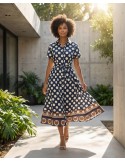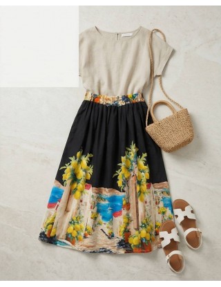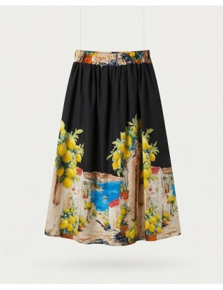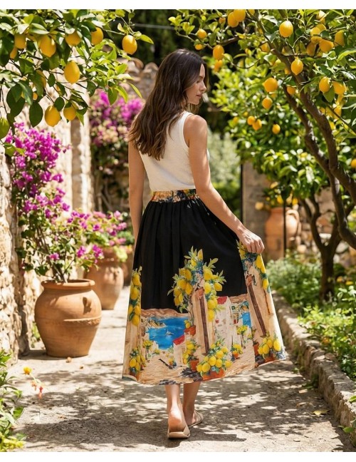 Unesite dašak Mediterana u svoj ormar uz ovu midi suknju s predivnim motivom limuna i morske obale. Elastična guma u struku osigurava savršenu udobnost, dok lepršavi kroj s naborima stvara ženstvenu i chic siluetu za tople dane.
