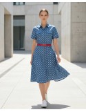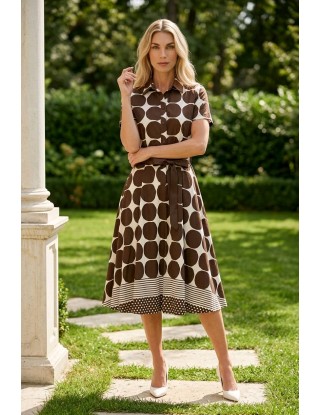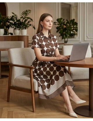 Elegantna košulja-haljina ističe se hrabrim printom velikih točaka i sofisticiranim detaljima na rubu te prugastim i točkastim uzorcima. Uski pojas s mašnom u struku lijepo oblikuje siluetu, čineći ju svestranim komadom idealnim za dnevne i večernje prigode.