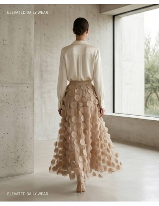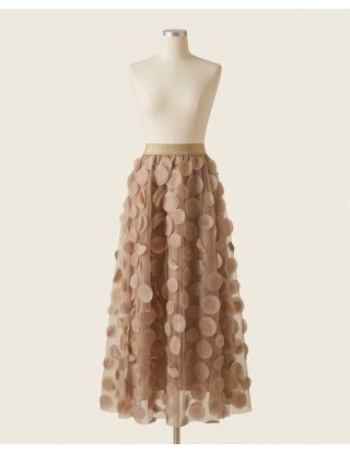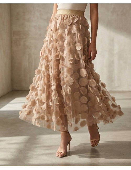 Upečatljiva suknja pravi je "statement" komad zahvaljujući svojoj bogatoj teksturi i volumenu. Izrađena od laganog materijala s podstavom, cijelom je površinom ukrašena 3D aplikacijama u obliku krugova koji joj daju razigran i luksuzan izgled. Visoki elastični struk osigurava udobnost, dok lepršavi kroj stvara bajkovitu siluetu idealnu za svečane prigode u kojima želite ostati zapamćeni.