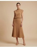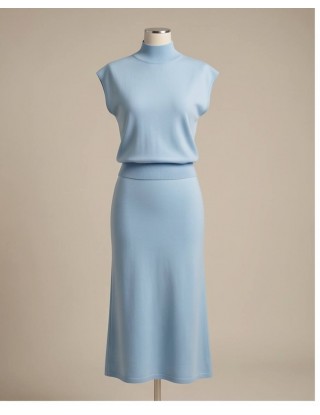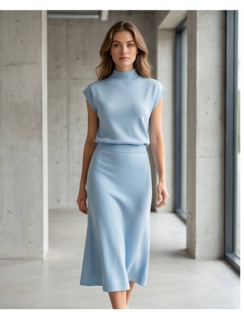 Dvodijelni chic pleteni komplet koji vrišti "skupi minimalizam". Kombinacija elegantnog topa s poludolčevitom i lepršave midi suknje stvara besprijekornu siluetu. Savršen je izbor za sve svečane prigode u kojima želite ostaviti dojam bez previše truda.