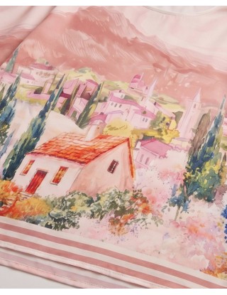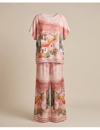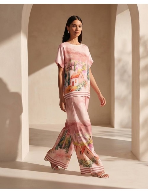 Profinjeni dvodijelni komplet spaja udobnost i visoku modu kroz jedinstveni print inspiriran slikovitim mediteranskim pejzažima. Sastoji se od bluze ležernog kroja i hlača širokih nogavica, izrađenih od laganog, svilenkastog materijala koji osigurava vrhunsku eleganciju pri svakom koraku.