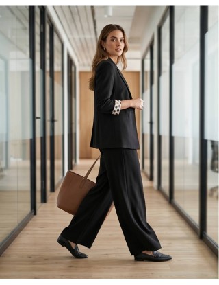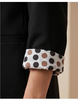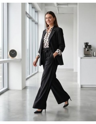 Komplet se sastoji od strukturiranog sakoa s gumbom i elegantnih hlača širokih nogavica. Poseban detalj čini podstava sakoa s krupnim točkama. Hlače visokog struka s naborima i pojasom koji se veže u mašnu osiguravaju vrhunsku udobnost tijekom cijelog dana.