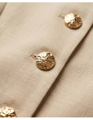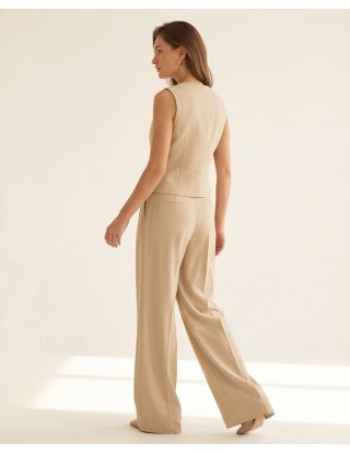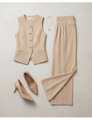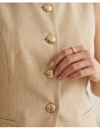 Strukirani prsluk bez rukava s ukrasnim zlatnim gumbima i tankim remenom savršeno se nadopunjuje s hlačama širokog kroja i visokog struka, stvarajući otmjenu figuru.