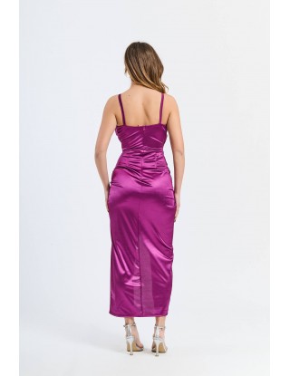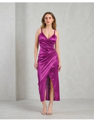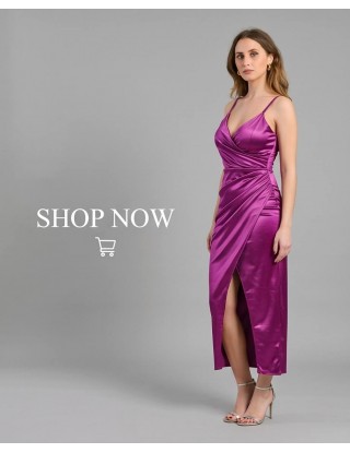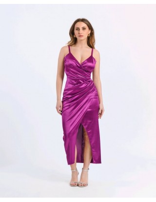 Elegantna haljina od satenskog materijala koji svojim bogatim sjajem suptilno reflektira svjetlost i naglašava ženstvenu siluetu. Karakterizira je moderan V-izrez s tankim naramenicama te nabori na prednjem dijelu koji kreiraju efekt preklopa, dajući dizajnu dubinu, teksturu i dodatnu dozu profinjenosti.
