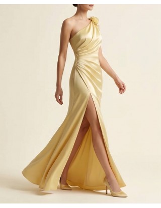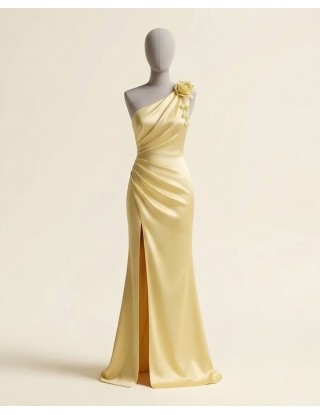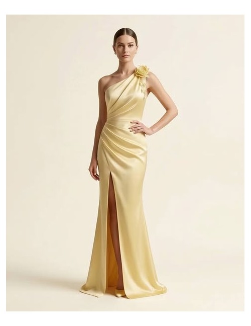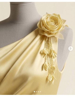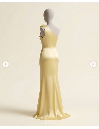 Prekrasna haljina od luksuznog, sjajnog saten materijala koji prekrasno reflektira svjetlost i naglašava figuru. Karakterizira je moderan asimetrični izrez na jedno rame, ukrašen elegantnim trodimenzionalnim cvjetnim detaljem (ruža) na ramenu. Haljina prati liniju tijela i širi se u elegantnu "mermaid" siluetu koja seže do poda.