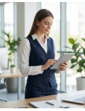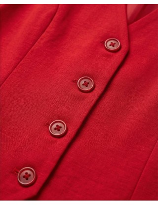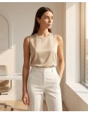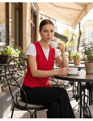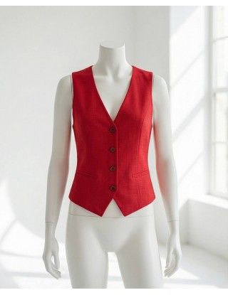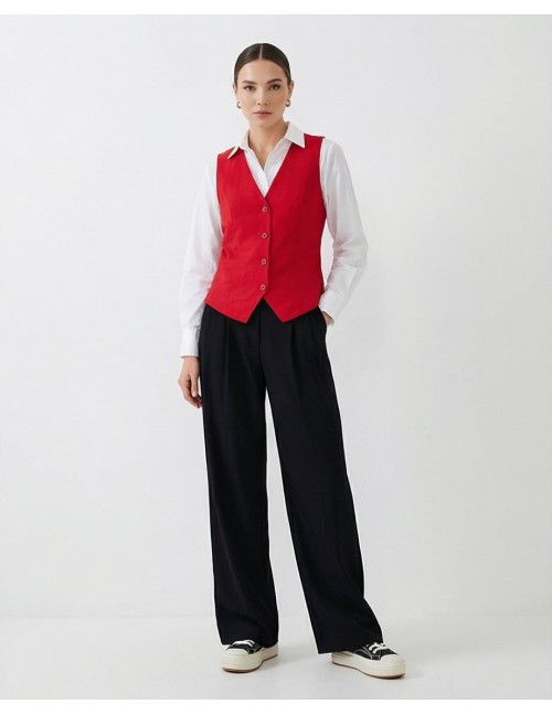 Elegantni prsluk bez rukava od laganog, blago zgužvanog materijala. Ima V-izrez, dugmad sprijeda i moderan kroj koji ističe struk. Idealan za poslovne i svečane kombinacije, lako se uklapa uz hlače ili suknje za sofisticiran izgled.