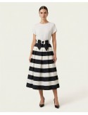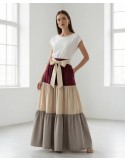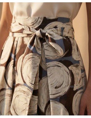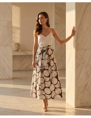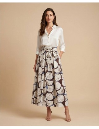 Duga suknja ukrašena upečatljivim apstraktnim uzorkom velikih kružnih motiva u bež i bijelim tonovima na tamno smeđoj i sivoj podlozi. Materijal je lagan, a kroj lepršav, što omogućuje slobodu kretanja.