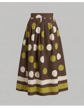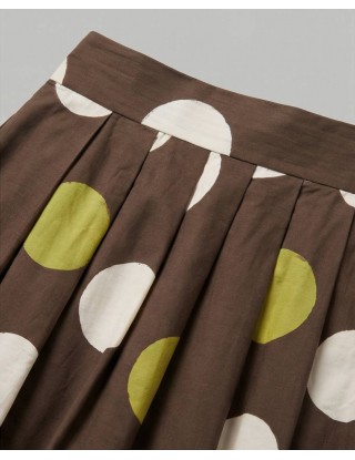 Duga smeđa suknja A kroja s visokim strukom, ukrašena velikim točkama u bijeloj i maslinasto zelenoj boji. Pri dnu suknje nalaze se dekorativne horizontalne pruge u kombinaciji bijele, smeđe i maslinasto zelene boje.
