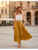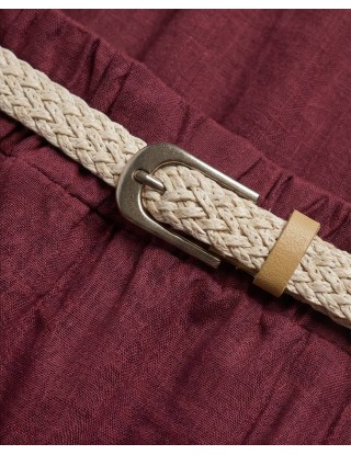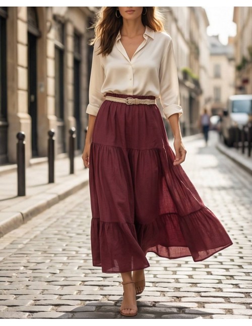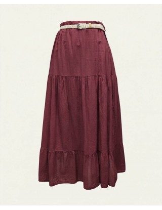 Midi suknja u bordo nijansi, lepršavog kroja s volanom pri dnu, u struku stegnuta pletenim bež remenom. S podstavom. Jednostavna i elegantna, idealna za ležerne kombinacije.