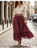 Midi suknja u maslinastoj nijansi, lepršavog kroja s volanom pri dnu, u struku stegnuta pletenim bež remenom. S podstavom. Jednostavna i elegantna, idealna za ležerne kombinacije.