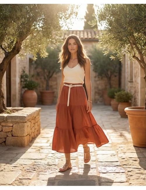 Midi suknja u cigla crvenoj nijansi, lepršavog kroja s volanom pri dnu, u struku stegnuta pletenim bež remenom. S podstavom. Jednostavna i elegantna, idealna za ležerne kombinacije.