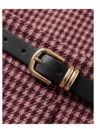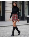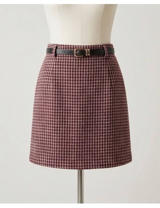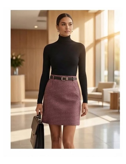 Elegantna mini suknja s klasičnim "houndstooth" (pepito) uzorkom u smeđim tonovima predstavlja bezvremenski dodatak svakoj garderobi. Profinjen kroj upotpunjen je pripadajućim tankim crnim remenom koji naglašava struk i daje dodatnu dozu elegancije. Izrađena od toplijeg materijala, savršeno se kombinira uz visoke čizme i pletivo, čineći je idealnim izborom za poslovne prilike ili chic dnevne izlaske.