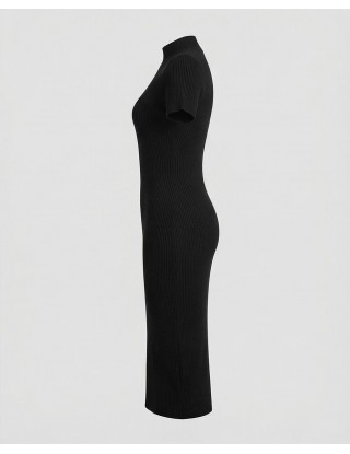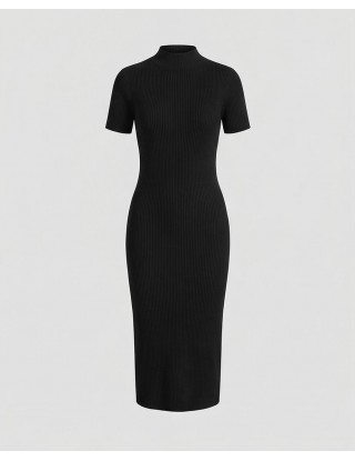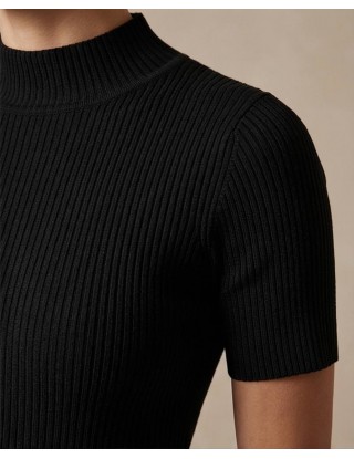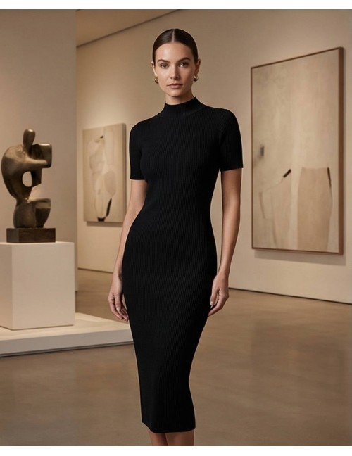 Pletena haljina u crnoj boji izrađena je od mekane viskoze koja nježno prati liniju tijela, naglašavajući ženstvenu siluetu uz maksimalnu udobnost. Diskretni poludolčevita ovratnik i kratki rukavi daju joj moderan izgled, čineći je idealnim izborom za prijelazno razdoblje. Zahvaljujući svojoj svestranosti i bezvremenskom dizajnu, lako se transformira iz ležerne dnevne varijante u profinjenu kombinaciju za večernje prilike.