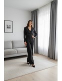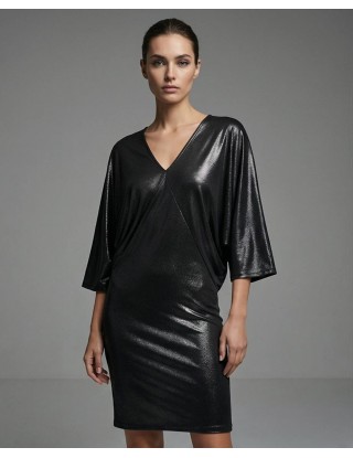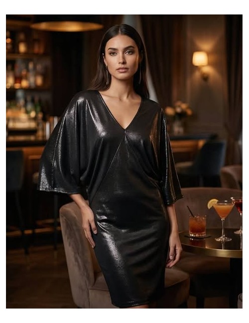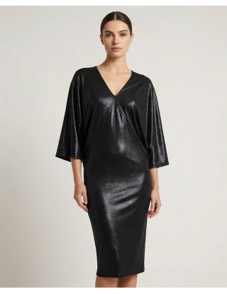 Crna haljina sa šišmiš rukavima idealna za večernje prigode ili svečane događaje. Posebnost haljine je u kroju s elegantnim V-izrezom i širokim rukavima dužine do laktova, što pruža osjećaj lakoće i profinjenosti. Zahvaljujući bezvremenskom kroju, ova se haljina lako kombinira uz upečatljive modne dodatke i elegantne gležnjače ili salonke.