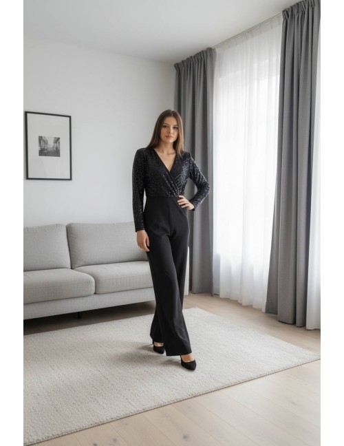 Crni kombinezon idealan za svečane prigode u kojima želite ostaviti snažan dojam. Gornji dio izrađen je od svjetlucavih šljokica s efektnim preklopom na V-izrez i dugim rukavima, dok donji dio čine hlače ravnog i širokog kroja koje vizualno izdužuju figuru. Naglašen struk osigurava besprijekornu siluetu, pružajući istovremeno moderan izgled i maksimalnu udobnost tijekom cijele večeri.