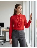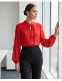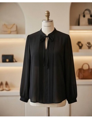 Crna bluza ističe se elegantnom mašnom i decentnim okomitim naborima koji izdužuju figuru. Izrađena je od lagane, blago prozirne tkanine s dugim prostranim rukavima i klasičnim manžetama, što je čini savršenim izborom za poslovne prilike i svečane trenutke. Njezin svestrani dizajn omogućuje lako kombiniranje s hlačama visokog struka ili elegantnim suknjama za besprijekoran i profesionalan izgled.