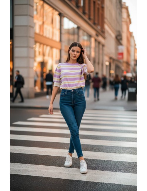 Lagana pletena majica s kratkim rukavima kombinira pastelne boje s decentnim prugicama. Klasičan okrugli izrez i rastezljivi rubovi čine je vrlo udobnom i idealnom za proljetne slojevite kombinacije.