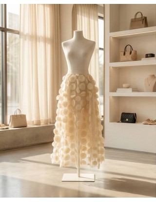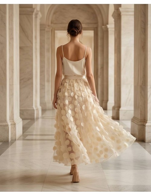 Upečatljiva suknja pravi je "statement" komad zahvaljujući svojoj bogatoj teksturi i volumenu. Izrađena od laganog materijala s podstavom, cijelom je površinom ukrašena 3D aplikacijama u obliku krugova koji joj daju razigran i luksuzan izgled. Visoki elastični struk osigurava udobnost, dok lepršavi kroj stvara bajkovitu siluetu idealnu za svečane prigode u kojima želite ostati zapamćeni.