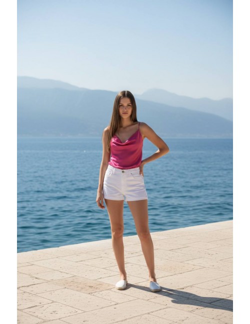 Majica sa prepoznatljivim "waterfall" - vodopad dekolteom koji lijepo pada i daje sofisticiran, ženstven izgled. Materijal je svilenkast, s blagim sjajem karakterističnim za saten. Ovaj model je idealan za večernje izlaske, posebne prilike, ali se može nositi i u ležernim kombinacijama uz sako, traperice ili suknju. Klasična bijela boja čini je lako uklopivom u različite stilove i kombinacije.