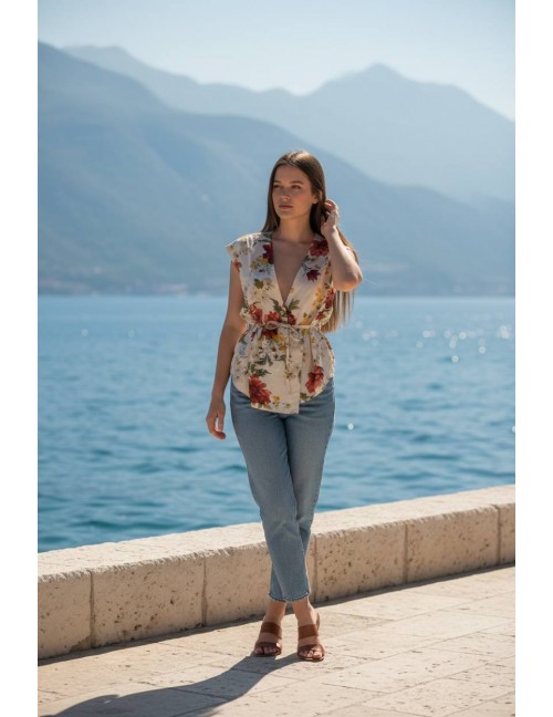 Prsluk bez rukava sa krojem na preklop koji se veže pojasom oko struka u svijetlim tonovima s izraženim cvjetnim uzorkom. Dominiraju veliki crveni cvjetovi, uz dodatak žutih i bijelih cvjetova te zelenog lišća. Materijal lagan, a stil ležeran i elegantan, prikladan za ljetne dane.