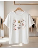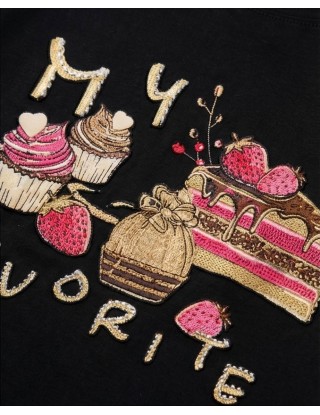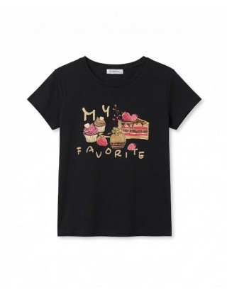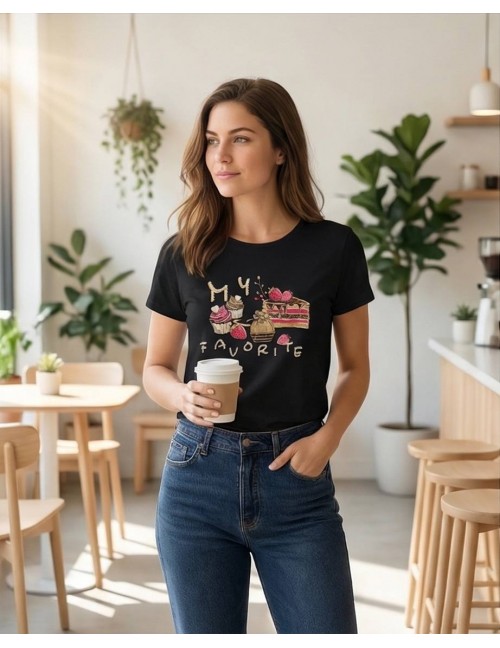 Crna pamučna majica s veselim printom slatkiša u toplim tonovima roze, bež i zlatne. Na prednjem dijelu nalazi se motiv kolača, muffina i torte uz natpis “My Favorite”, što joj daje razigran i simpatičan izgled. Kroj je klasičan, s kratkim rukavima i okruglim izrezom. Mekana i udobna, savršena za svakodnevno nošenje uz traperice, kratke hlače ili suknju.