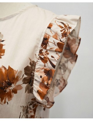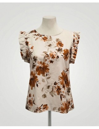 Bluza s nježnim cvjetnim printom u narančastim i bež tonovima. Kratki rukavi s laganim volanima daju romantičan i ženstven izgled, a savršena za kombiniranje s jednostavnim suknjama i hlačama.