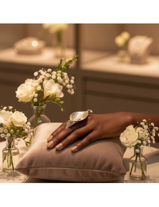Sofisticiran prsten izrađen od nehrđajućeg čelika u srebrnom tonu plijeni pažnju svojim dizajnom inspiriranim laticom cvijeta kale. Zahvaljujući kvalitetnom materijalu, nakit zadržava svoj izvorni sjaj i otpornost, čineći ga idealnim izborom za svečane prilike ili kao upečatljiv detalj u svakodnevnim modnim kombinacijama.