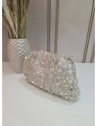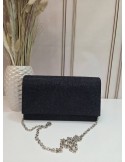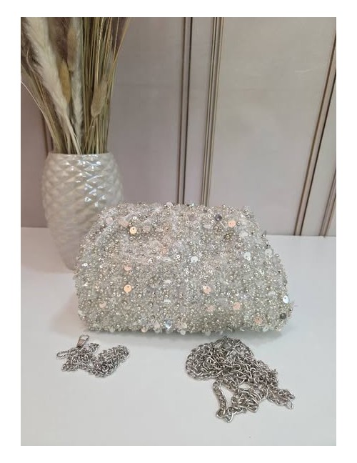 Elegantna srebrna svečana torbica vrećastog oblika sa šljokicama, sadrži dugi remen za nošenje preko ramena ili tijela.